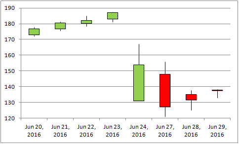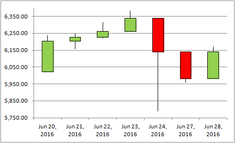 Until Thursday, the day of the referendum, there was a cautious optimism on the market with prices increasing each day. The win of the Remain campaign would have meant a reassuring stability, whereas the country's decision to leave the EU resulted in a plunge of stock prices on Friday. The fall continued on Monday, as well, but on Tuesday the index bounced back to where it closed last week. Today it was constantly rising and as you can see on the chart, the closing price reached a new peak.
