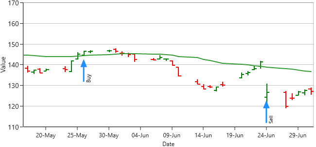 On this 1-year chart you can see that the price has decreased since last July, so simply buying and keeping the stocks would have meant a loss of 10,52%. Although taking a short position would have been profitable, without a strategy, both deals are just about waiting and hoping. However, it's really exciting to observe the blue arrows. They indicate points for buying and selling based on the strategy outlined above.
